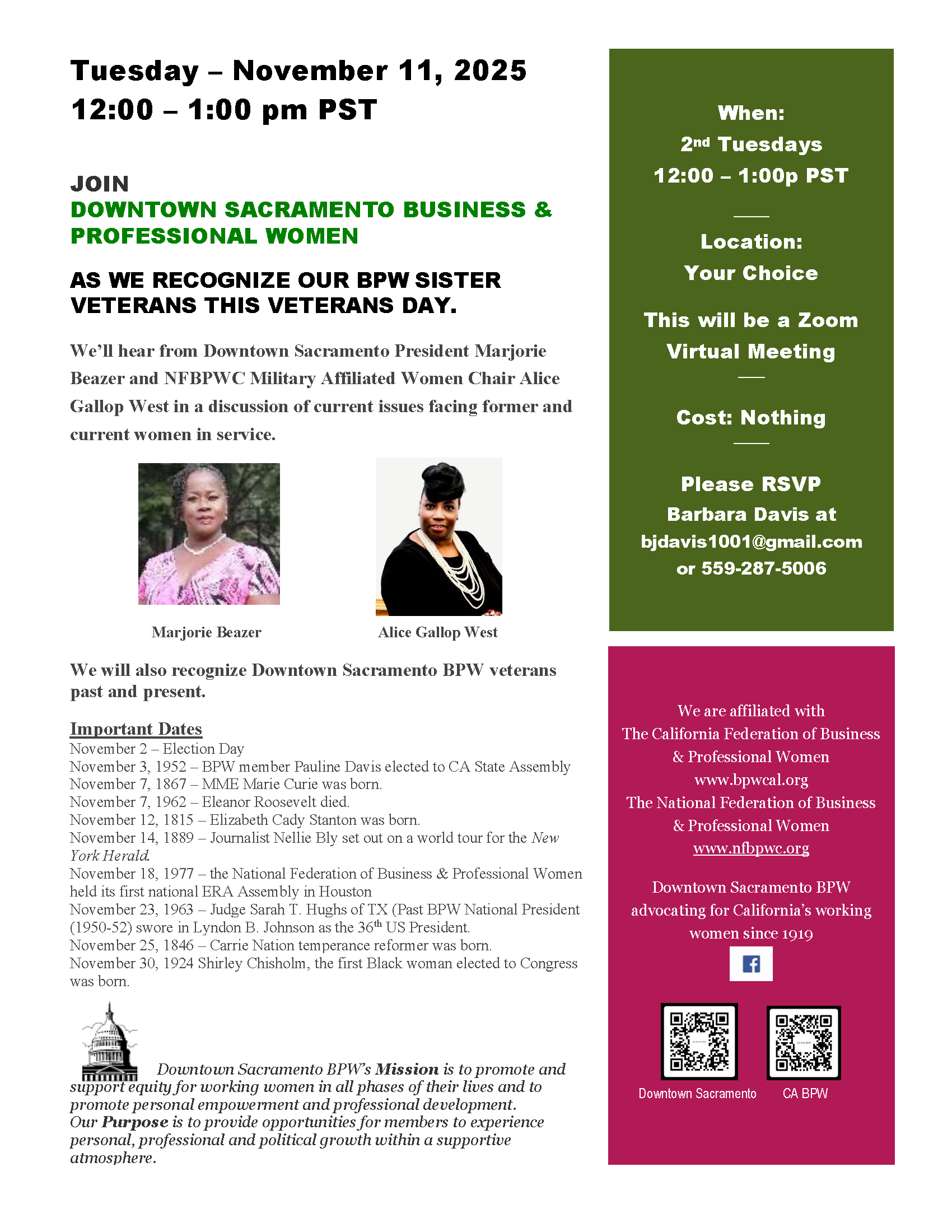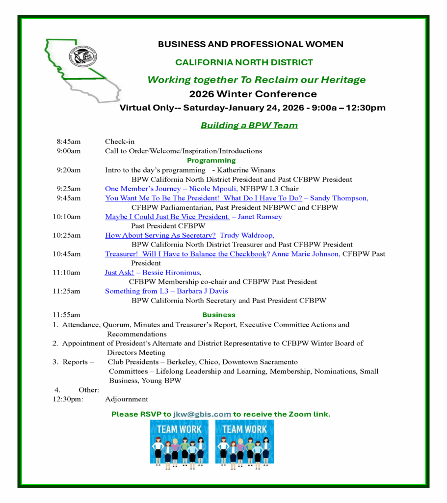 Parliamentarian: Barbara J Davis (Downtown Sacramento BPW) bjdavis1001@gmail.com