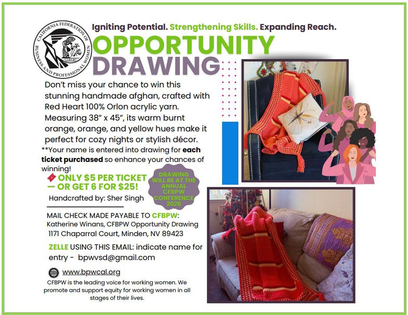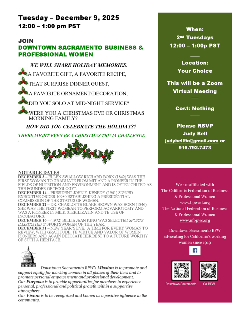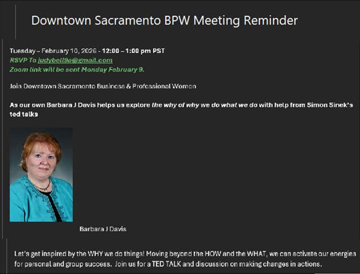 Secretary: Barbara J. Davis (Downtown Sacramento BPW) bjdavis1001@gmail.com