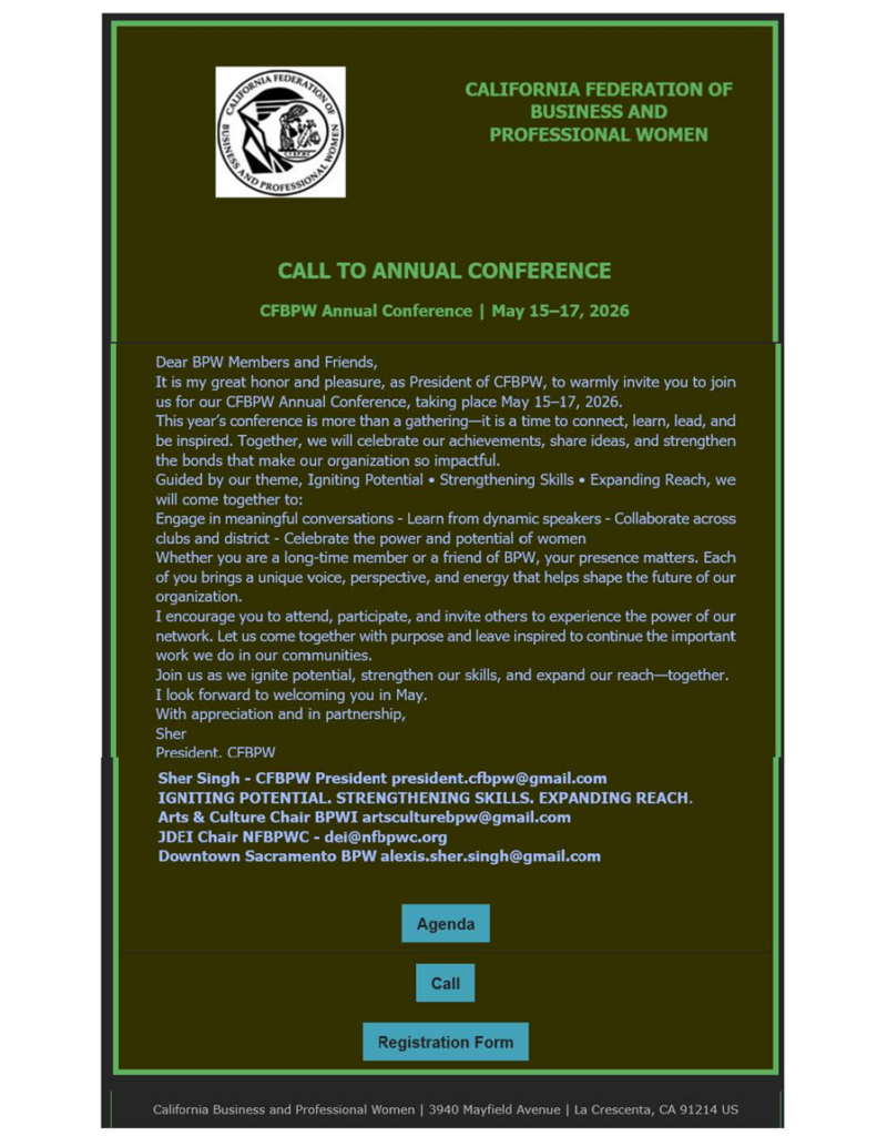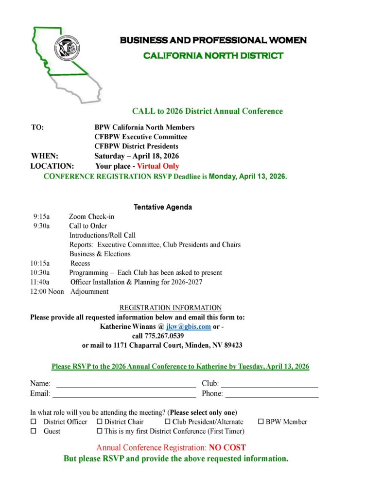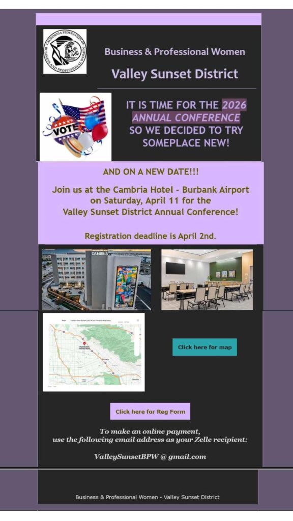 Friday, May 16th-Sunday, May 18th at the Courtyard by Marriott, 2100 West Empire Avenue, Burbank, CA 91504 and via Zoom. This is an opportunity for CFBPW members to engage in vital discussions surrounding the direction of our organization, including a vote on Bylaws amendments and the rewrite of our Policies and Procedures. At the Conference you will also hear from speakers who will share with us with their insights on pressing topics. Mark your calendars and prepare to actively participate in shaping the policies that impact our organization—your voice matters!! Additional information will be available in the California Woman. Click here for the Call with hotel information Annual Call-2025. Click here for the registration form Registration Form. Click here for the agenda Annual Agenda. Click here for the proposed Bylaws’ amendments Proposed Bylaws Amendments 2025. Click here for the proposed Policies and Procedures CFBPW Policy and Procedures 2025. Contact Anne Marie president@bpwcal.org for more information.