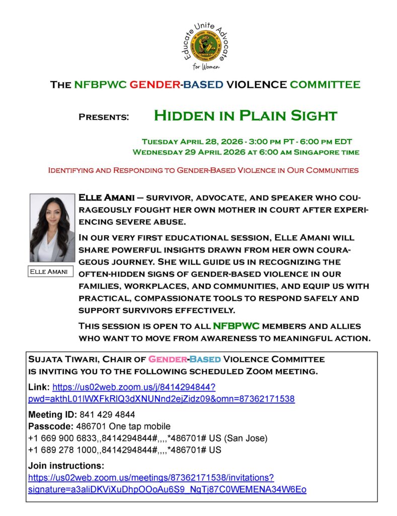 – Hear the latest from National BPW Vice President of Advocacy, Emily VanVleck. Join and learn how to use their One-Click Politics to make your voice heard.