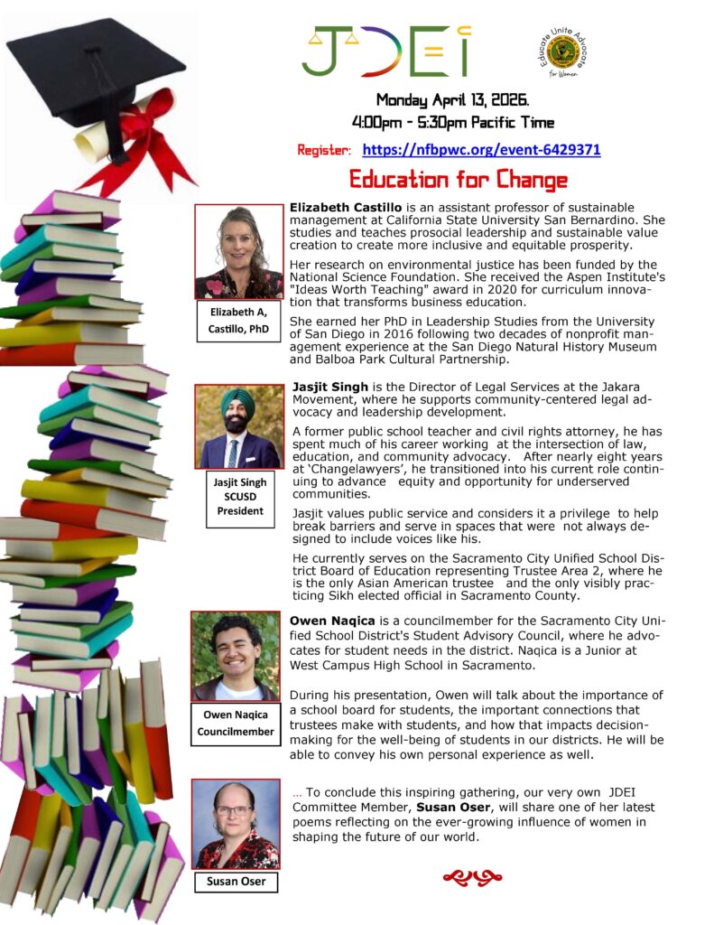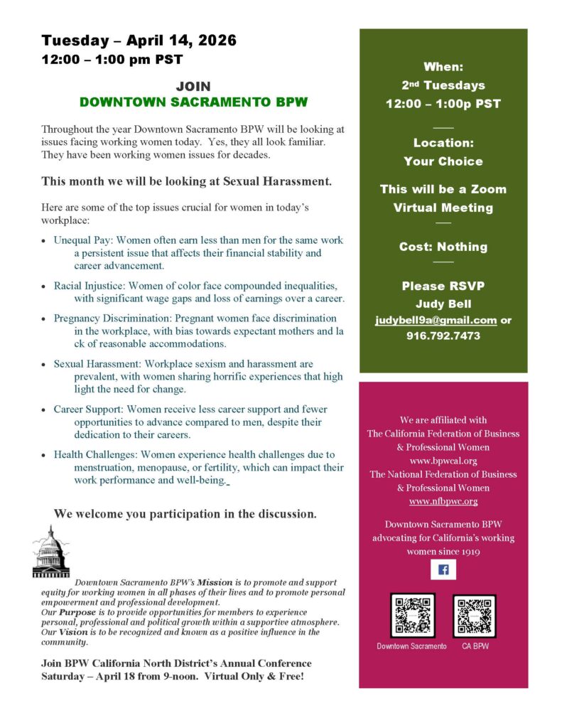 Tuesday, May 13th 12 noon-1:00 P.M. Program: President’s Five Point Goals for 2025-26. Click here for the flyer and more information PDF Version – 5-13-25 Sac BPW . Contact bjdavis1001@gmail.com to get the Zoom link.